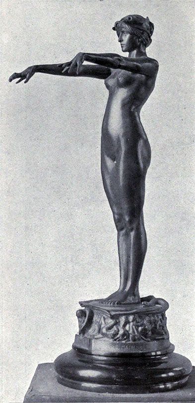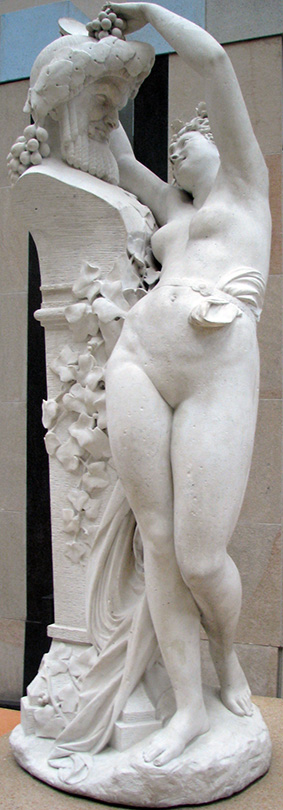 En sculpture les artistes s’intéressent aux bacchantes, des servantes du dieu Bacchus dans la mythologie romaine. Elles l’accompagnent lors de fêtes appelées bacchanales. Elles s’y livrent à des délires et des débordements du corps sous l’influence du vin. Les artistes nourrissent une fascination pour leur passion charnelle et leur extase intérieure liées aux festivités romaines. Cette figure devient l’allégorie de la femme moderne et représente une vision plus sauvage de la nudité féminine, contrastant ainsi avec la pudeur de l’époque.
